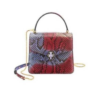Le sac a main Serpenti Forever est revisite dans un es*W*prit plus contemporain, avec de nouvelles nuances et des materiaux chics pour la saison. Ce modele en python « Chimera » raffine multi*w*colore peint a la main illustre la capacite des artisans Bvlgari a transformer des materiaux precieux en des pieces intemporelles. Le seduisant fermoir Serpenti en email noir et couleur lilas Lavender hypnotise avec ses yeux en onyx au cha*W*rme envoutant. Sac a main dote de trois compartiments et d’une chaine en forme de serpent ajustable et amovible avec bandouliere en cuir pour un look polyvalent. Petit modele avec poche a miroir et poche ouverte a l'interieur, et une poche plaquee a l'exterieur a l’arriere. La plaque en metal ornee du logo Bvlgari a l'interieur et le miroir personnalisable completent l’ensemble a la perfection. Dimensions : 18 x 15 x 9,5 cm.