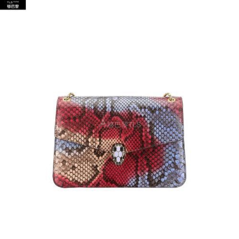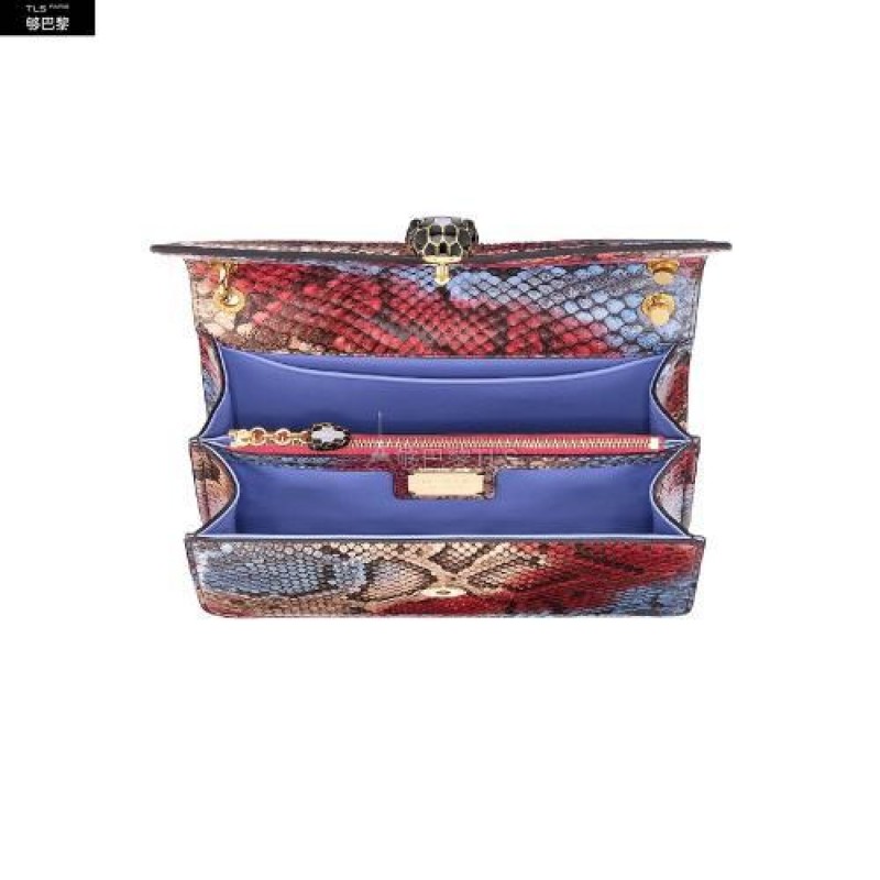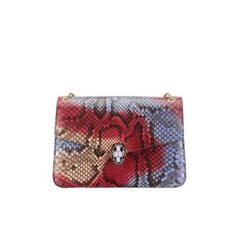 Ideal pour un look urbain, tendance et polyvalent, le nouveau sac a bandouliere Serpenti Forever confere une note de fraicheur a la collection Serpenti, avec de nouvelles nuances et des materiaux chics pour la saison. Ce modele en python « Chimera » raffine multi*w*colore peint a la main illustre la capacite des artisans Bvlgari a transformer des materiaux precieux en des pieces intemporelles. Le seduisant fermoir Serpenti en email noir et couleur lilas Lavender hypnotise avec ses yeux en onyx au cha*W*rme envoutant. Accessoire ideal d’un look de jour tendance, le sac se pare d’une chaine ondulee en forme de serpent ajustable et d’une bandouliere en cuir. Moyen modele dote de deux compartiments et d’un petit miroir personnalisable. Une poche ouverte, une poche a fermeture eclair et deux poches exterieures completent l’ensemble. Plaque en metal ornee du logo Bvlgari. Dimensions : 25