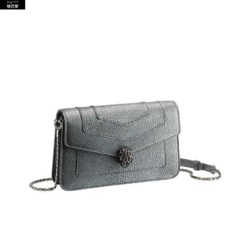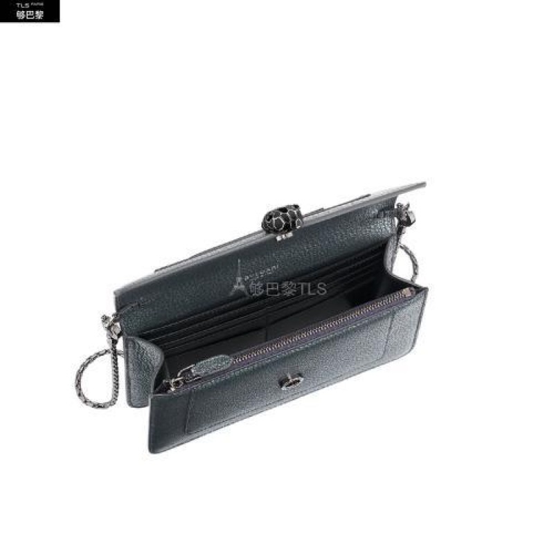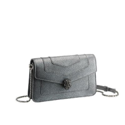 Ce nouveau portefeuille a chaine Serpenti Forever en cuir de chevre couleur gris Charcoal Diamond a effet perle a l’exterieur et en cuir nappa noir a l’interieur arbore des details en laiton plaque ruthenium fonce. Un fermoir pression emblematique Serpenti en email noir mat et brillant avec yeux en onyx, et une chaine amovible et reglable dotee d’une bandouliere en cuir completent l’ensemble. Un compartiment, six emplacements cartes de credit et une poche a fermeture eclair parachevent l’ensemble. Dimensions : 20 x 12 x 4 cm.