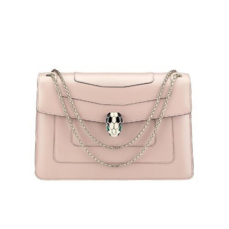 Le sac a bandouliere Serpenti Forever s'habille de nouvelles couleurs tendance. Ce modele en cuir de veau lisse couleur Crystal Rose est rehausse de details en laiton dore. Le fermoir emblematique Serpenti en email noir et blanc hypnotise avec ses yeux en malachite au cha*W*rme envoutant. Une chaine en laiton dore, inspiree par les ondulations du corps du serpent, et un petit miroir de poche completent l'ensemble. Moyen modele dote de deux compartiments a soufflet, de plusieurs poches interieures et d'une plaque en metal ornee du logo Bvlgari a l'interieur. Dimensions : 28 x 19 x 7,5 cm
