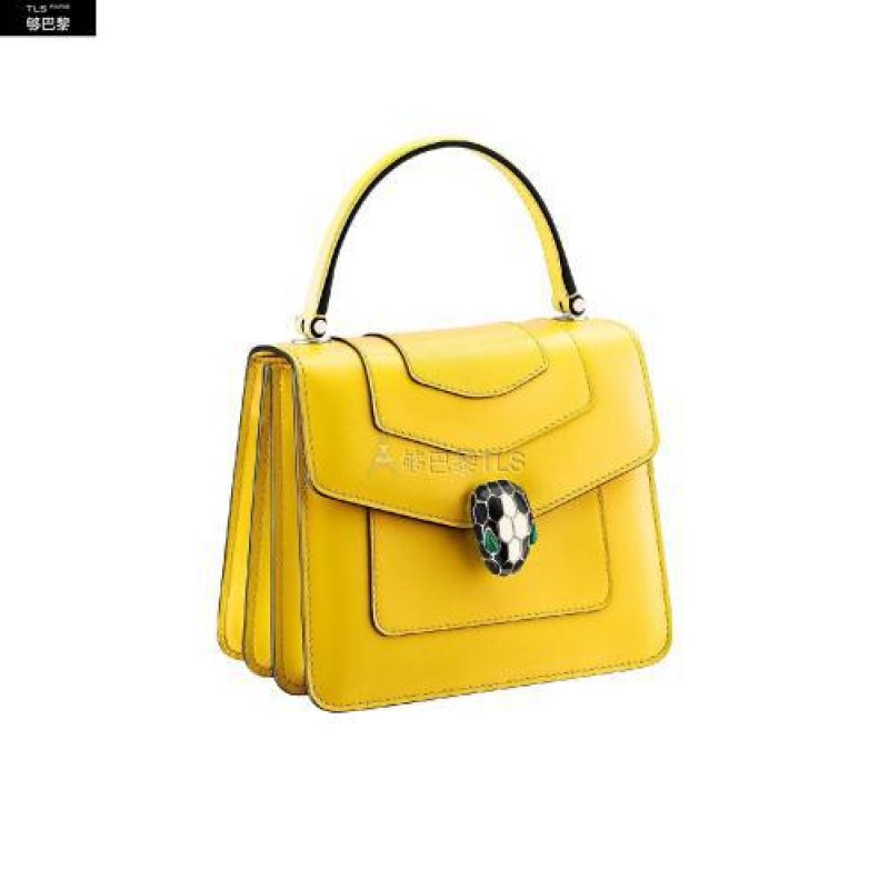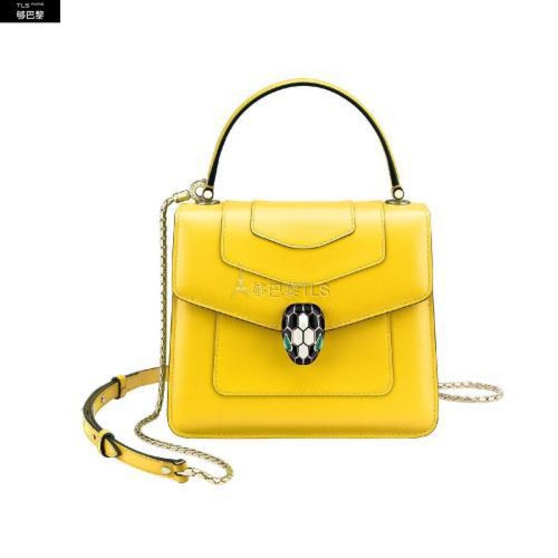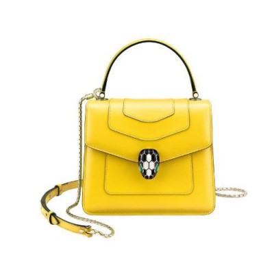 Le sac a bandouliere Serpenti Forever revet de nouvelles couleurs pour la saison. Ce modele en cuir de veau couleur Daisy Topaz est rehausse de details en laiton dore. Le fermoir emblematique Serpenti en email noir et couleur blanc agate hypnotise avec ses yeux en malachite au cha*W*rme envoutant. Sac a main dote de trois compartiments a soufflet et d’une chaine en forme de serpent ajustable et amovible avec bandouliere en cuir pour un look polyvalent. Petit modele dote d’un miroir de poche et d’une plaque en cuir ornee du logo Bvlgari. Dimensions : 18 x 15 x 9,5 cm.