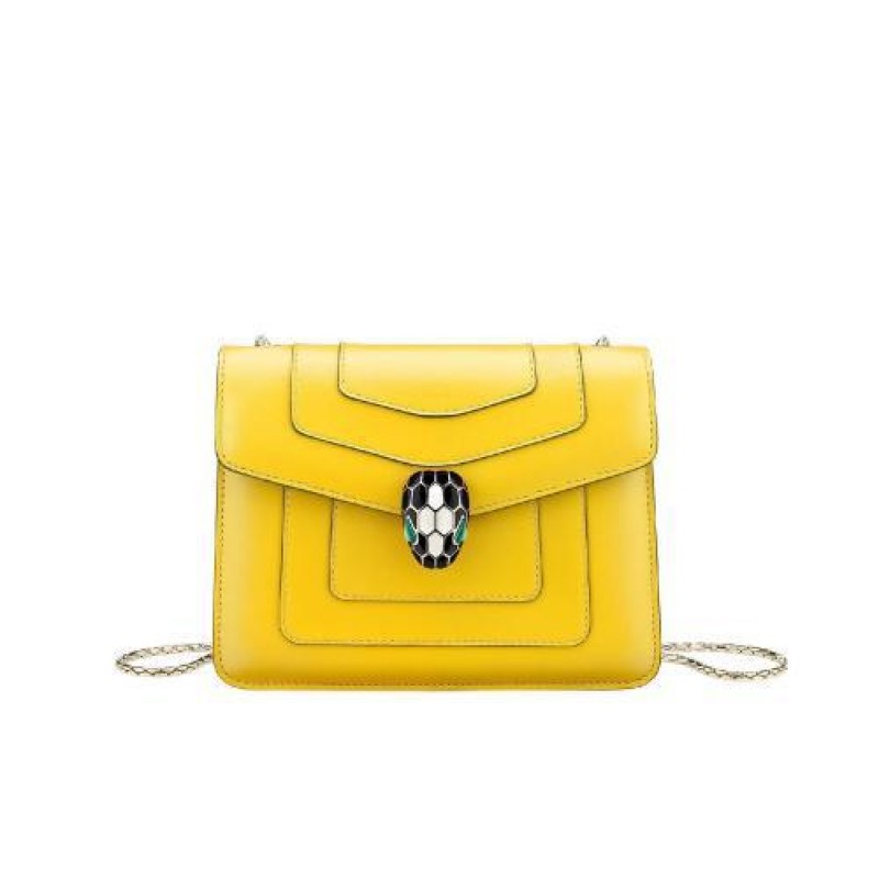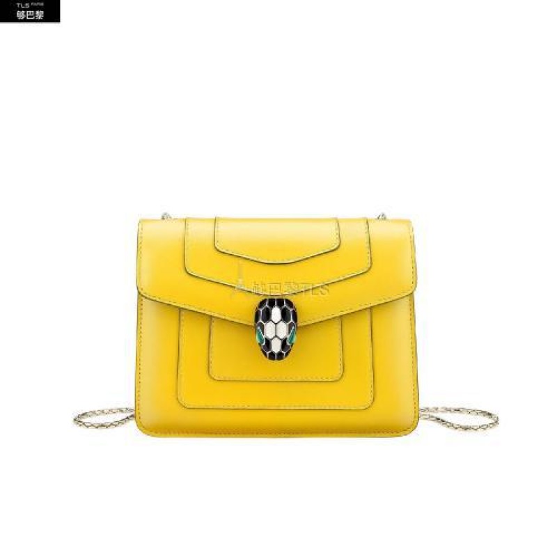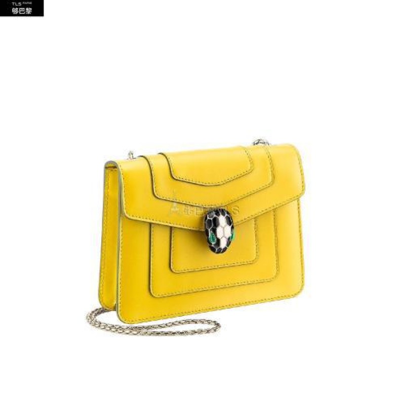 Le sac a bandouliere Serpenti Forever revet de nouvelles couleurs pour la saison. Ce modele en cuir de veau couleur Daisy Topaz est rehausse de details en laiton dore. Le fermoir emblematique Serpenti en email noir et couleur blanc agate hypnotise avec ses yeux en malachite au cha*W*rme envoutant. Une chaine en laiton dore, inspiree par l’allure sinueuse du serpent, une poche ouverte a l’interieur et un petit miroir de poche completent l’ensemble. Petit modele dote d’un compartiment a soufflet et d’une plaque en cuir ornee du logo Bvlgari. Dimensions : 20 x 14 x 4,5 cm.